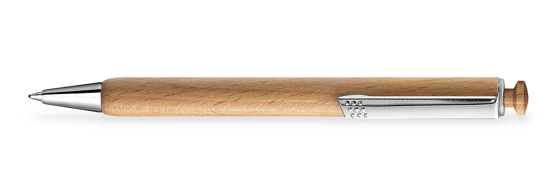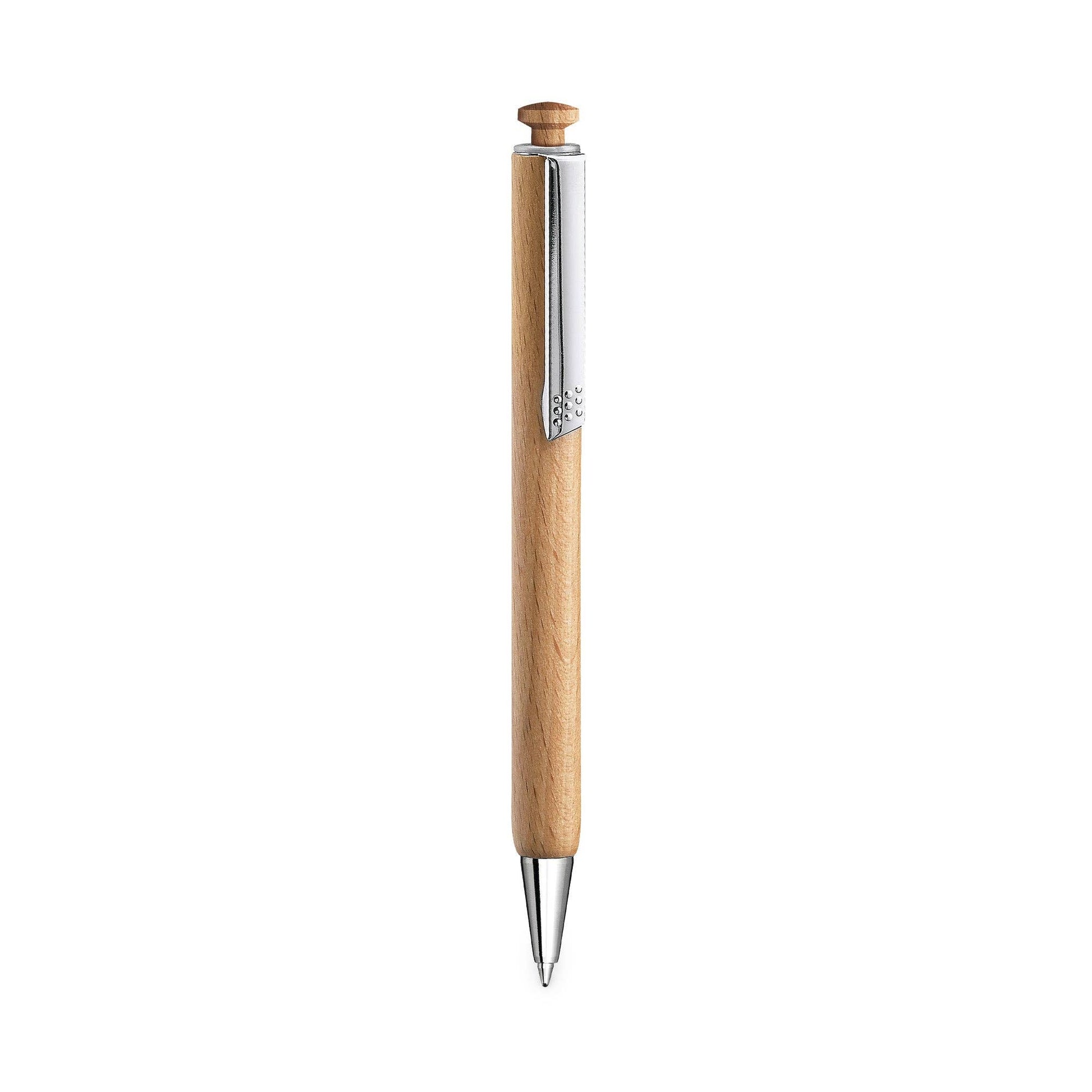 Our affordable all-purpose ballpoint pen made of solid beech wood with wooden presser and clip. A solid entry-level model in the world of sustainable writing instruments. PEFC certified solid beech wood, wooden handle.